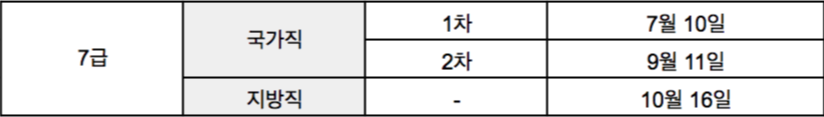 7급의 경우 국가직 1차 시험(PSAT)은 7월 10일 토요일, 국가직 2차 시험(전문과목)은 9월 11일 토요일에 진행될 예정입니다.