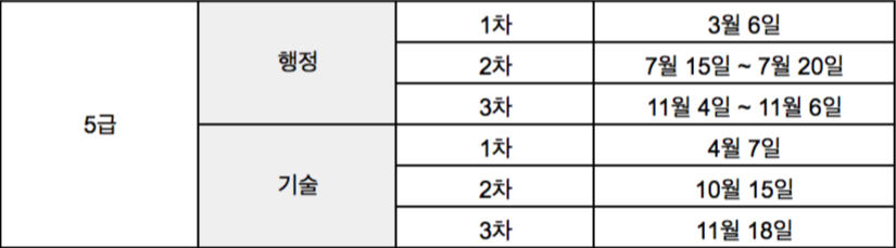 행정, 기술 두 직군으로 구분되는 5급은 공무원 시험은 시험일정에도 일부 차이가 있으니 직군에 따라 시험일정을 잘 확인하시기 바랍니다.