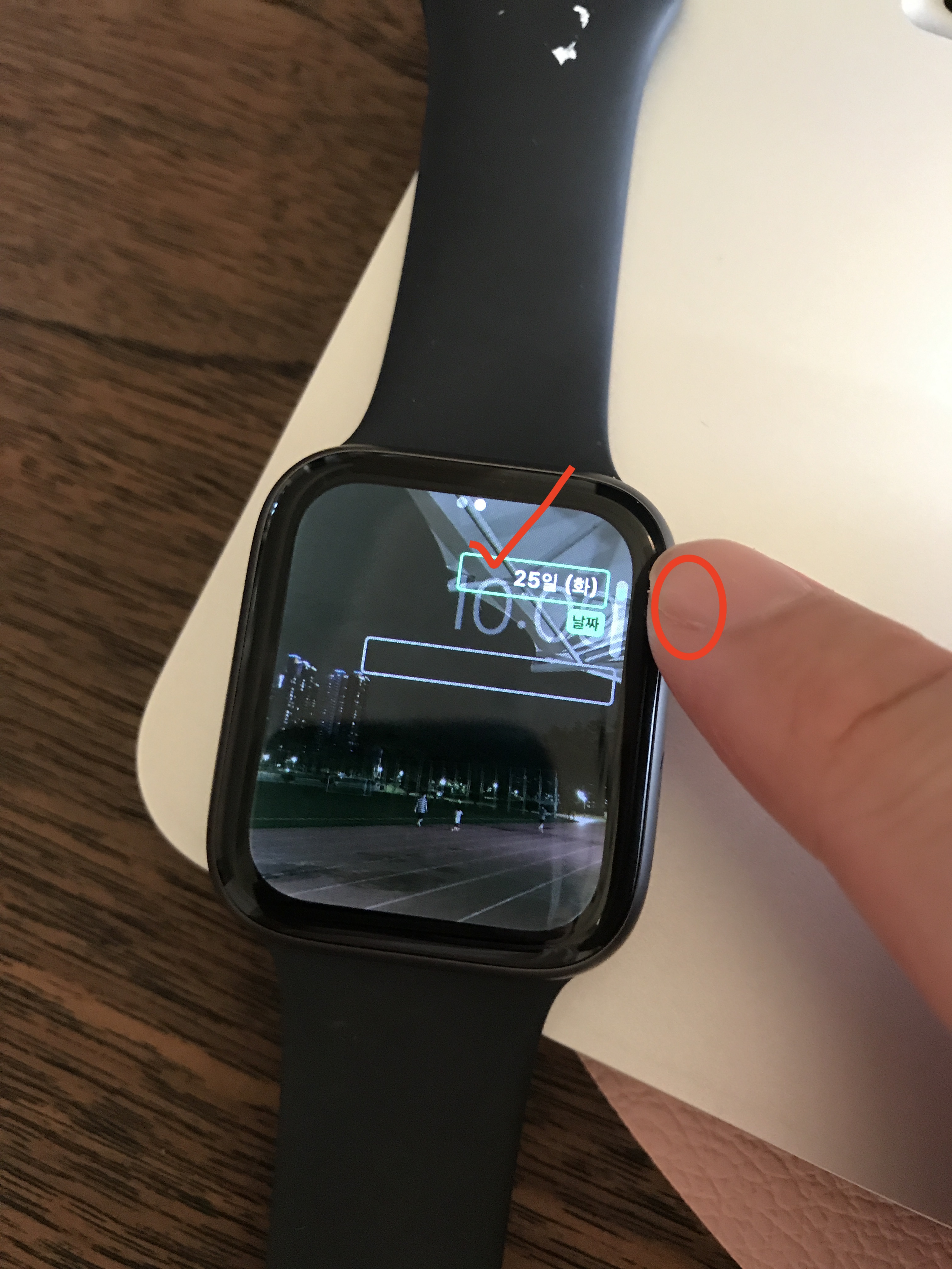 - 이때, 아래 사진처럼 두 개 사각형이 보이는데, 하나씩 터치한 후 크라운을 돌려 컴플리케이션을 설정합시다.