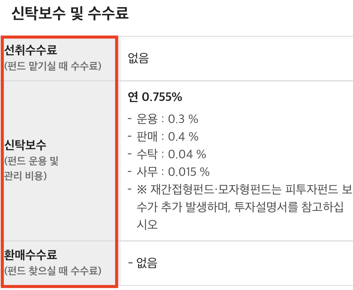 보시는 것처럼 총보수와 선취수수료가 나타나 있고, 각 보수가 얼마인지도 나타나 있습니다.