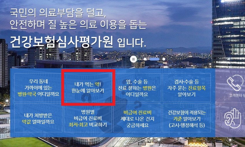 홈페이지에 들어가면 메인화면서 '내가 먹는 약! 한눈에 알아보기' 버튼이 보입니다.