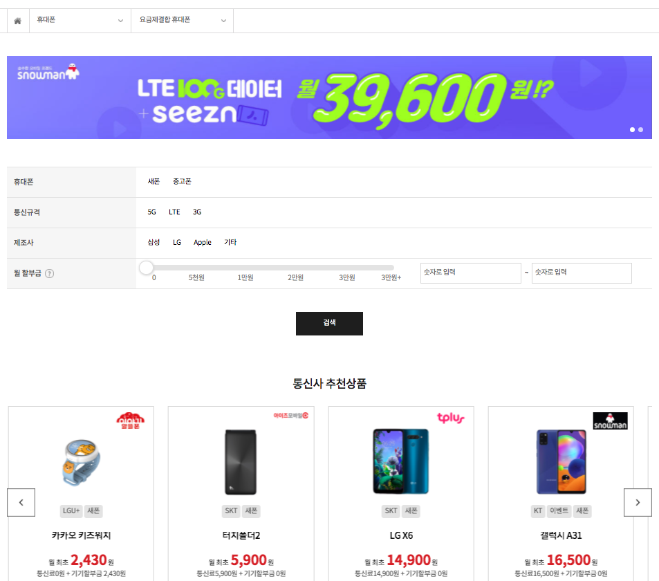 3사 모두 품질은 비슷하겠지만, 그래도 개인 선호가 있을 수 있는 부분이기에 통신망도 검색조건으로 넣어둔 것은 인상적이다.